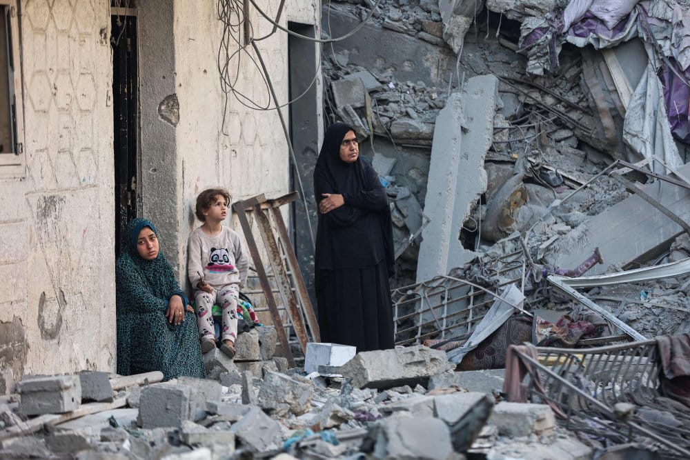 En kvinde og et barn sidder i ruinerne, efter at et hus blev ødelagt i israelske angreb tirsdag. En anden kvinde holder øje med redningsaktionen ikke langt derfra. - Foto: Omar Al-Qattaa/Ritzau Scanpix